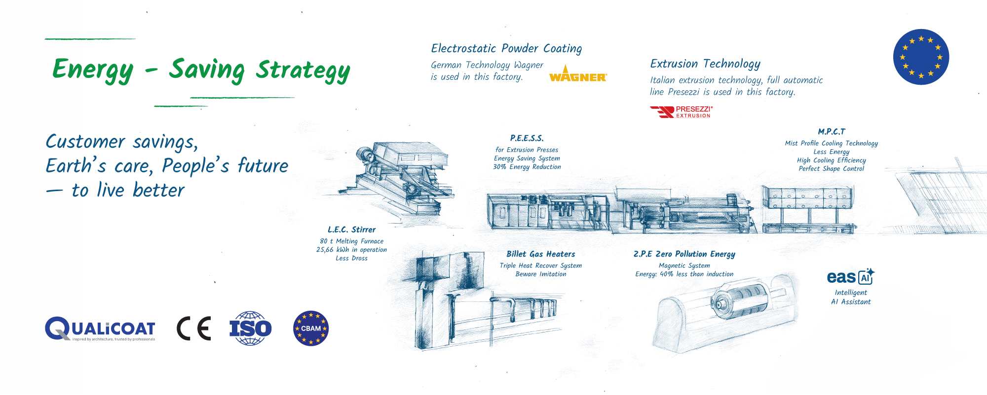 We utilize advanced German electrostatic powder coating technology from Wagner. By 2025, we will further enhance our capabilities with an additional fully automatic extrusion line, integrating cutting-edge Italian technology from Pressezi.